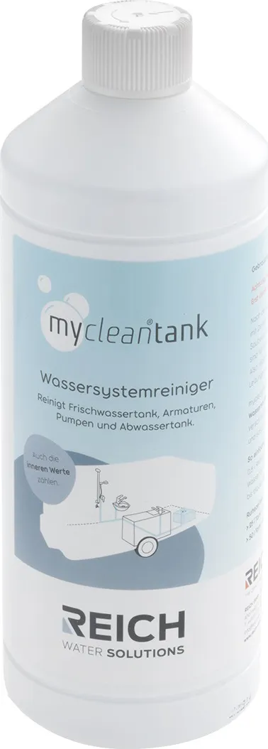Reich 5-in-1 Tank Cleaner cleans the water tank, water pipe, tap, waste water hose, and waste water tank, based on hydrogen peroxide. Reich tank cleaner is odorless and can be used for drinking water and waste water systems. Pour 0.5 liters of tank cleaner into the tank. Fill the tank until it is full. Open each of the taps until blue water comes out, then close them. After the application time, open the taps until the system is empty.