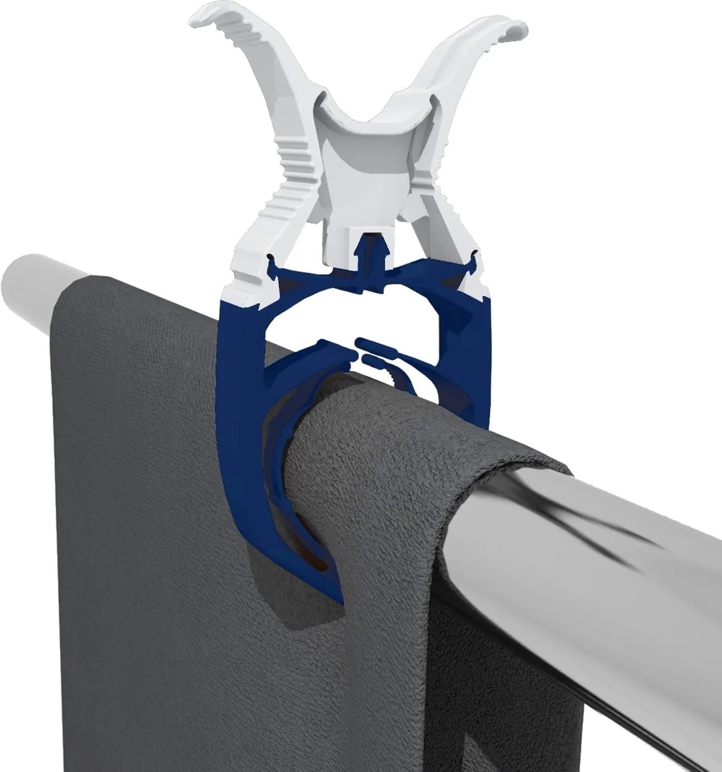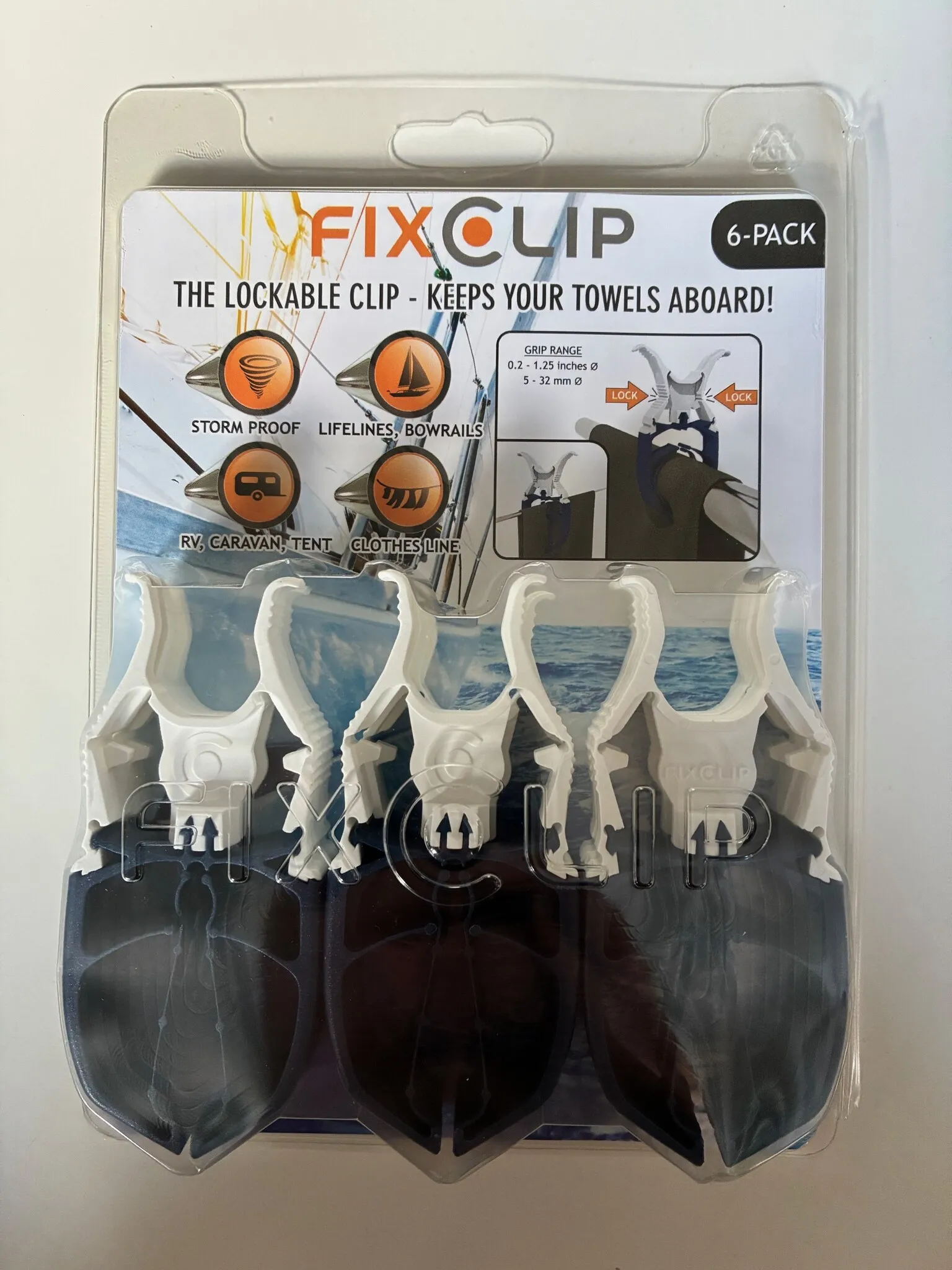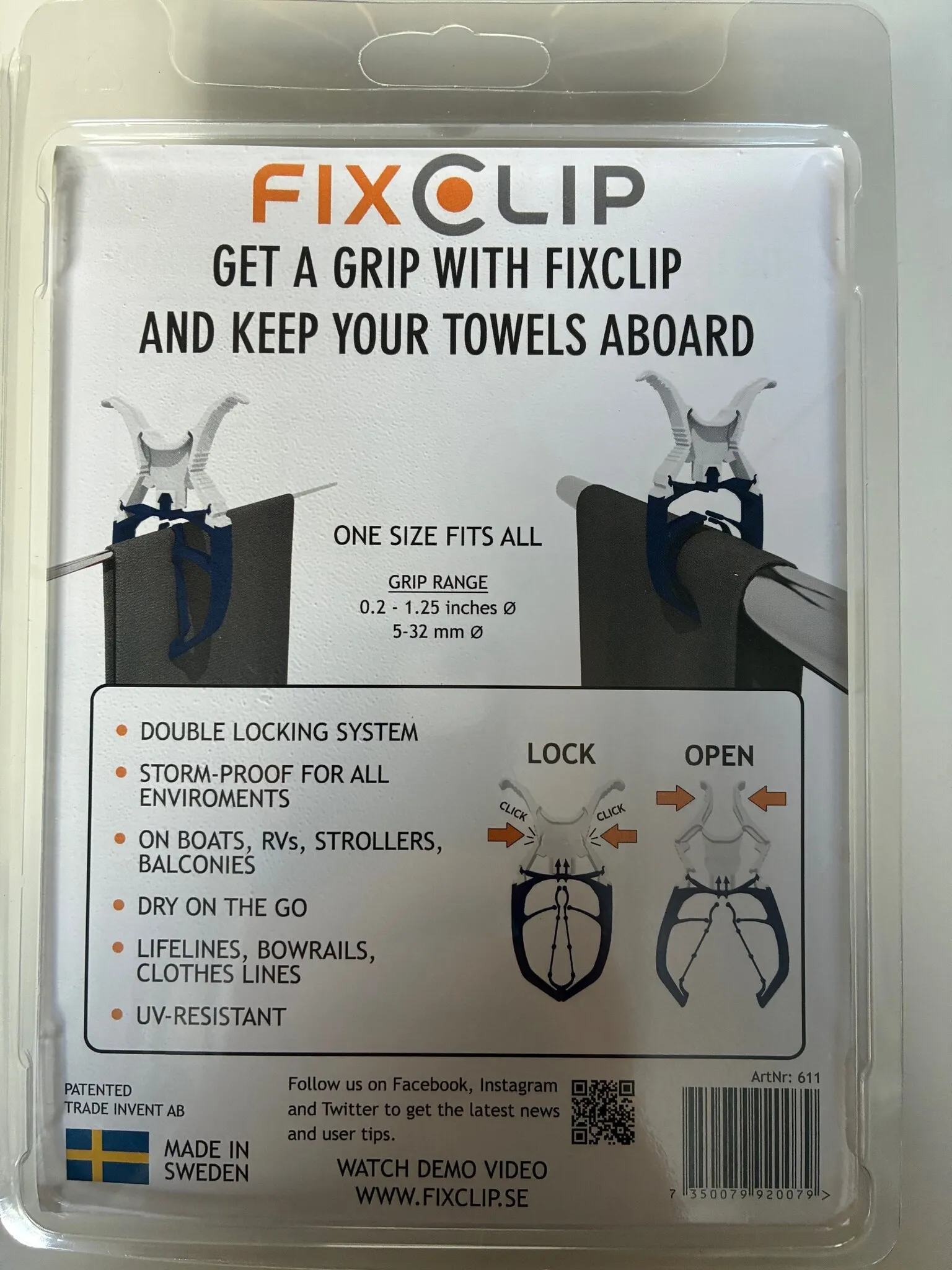 Fixclip afsluitbare knijper met gepatenteerde dubbele klemsysteem heeft unieke grip eigenschappen. FIXCLIP heeft geen metalen veer en kan dus niet roesten. Fixclip houdt handdoeken, kleding, afdekzeilen etc. stevig vast, zelfs met hele harde wind. Dit biedt nieuwe mogelijkheden, zoals kleding laten drogen/luchten tijdens het varen of thuis de was laten drogen op een winderig balkon.