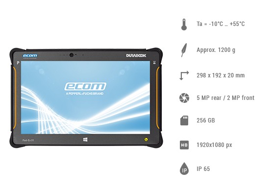 Ecom Pad-Ex - Windows Tablet (Zone 2 & Division 2)met camera's voor en achter. Voldoet aan alle milieuvereisten en ondersteunt de 8e generatie Intel Core i5-processor. Het biedt ook een batterijduur tot 7 uur en ondersteuning voor Windows 10 Pro. Voldoet aan IP65, 4 feet drop en MIL-STD 810G voor trillingen. Met zijn extra displaybescherming biedt het volledige bescherming tegen de barre omgeving die veldwerkers tegenkomen. Deze Ecom Pad-Ex - Windows Tablet heeft 11,6-inch breedbeeldscherm wat in zonlicht leesbaar is.