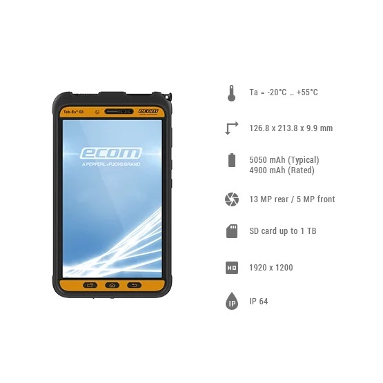 Ecom Tab-Ex 03 DZ2 is gebaseerd op de geavanceerde Galaxy Tab Active3. De Tab-Ex 03 is een ATEX zone 2/22 gecertificeerde tablet met camera. De tablet is ideaal voor mobiele werkers in de olie- en gassector, raffinaderijen, chemische en farmaceutische industrie en andere sectoren waar explosiegevaar bestaat.
