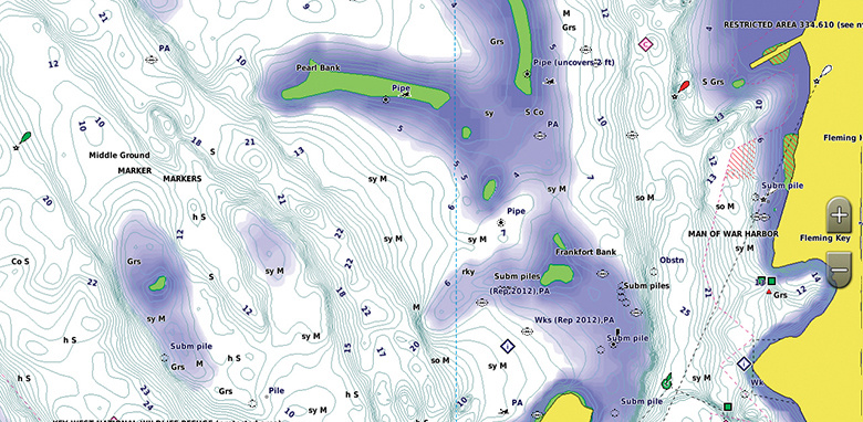 • Om een duidelijk beeld te geven van ondiepe wateren om te voorkomen, maakt de Shallow Water Shading schaduw mogelijk op een door de gebruiker gedefinieerde diepte
